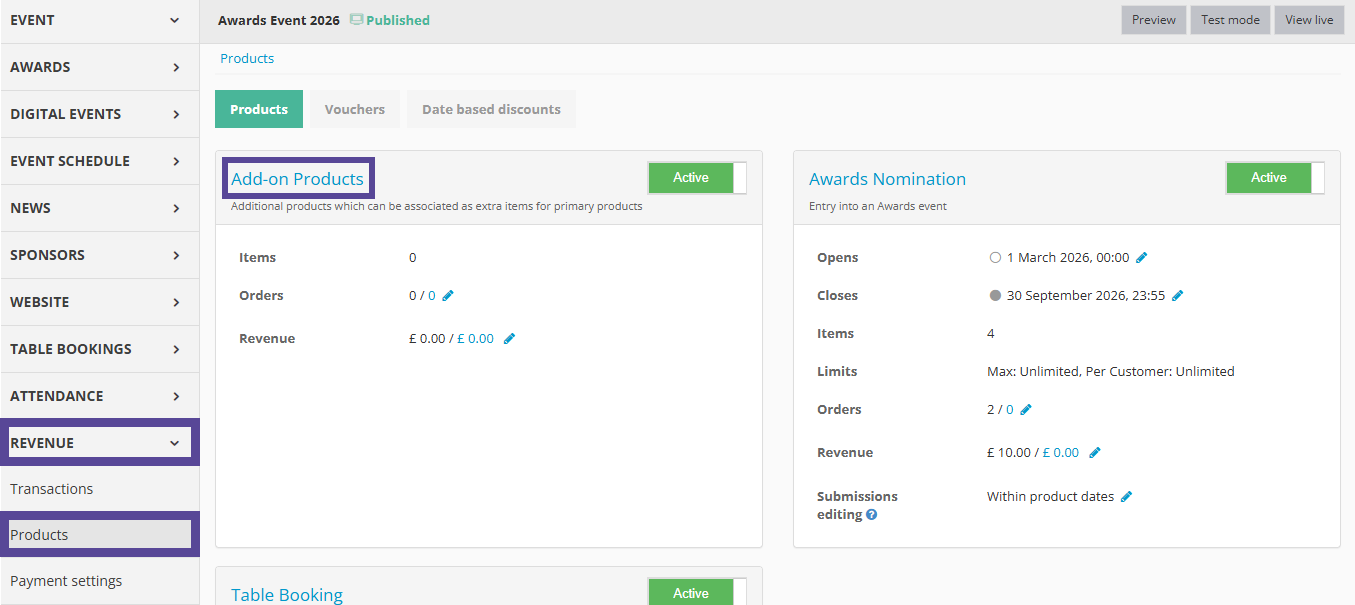 To get started, go to Revenue > Products, and click on Add-on Products.