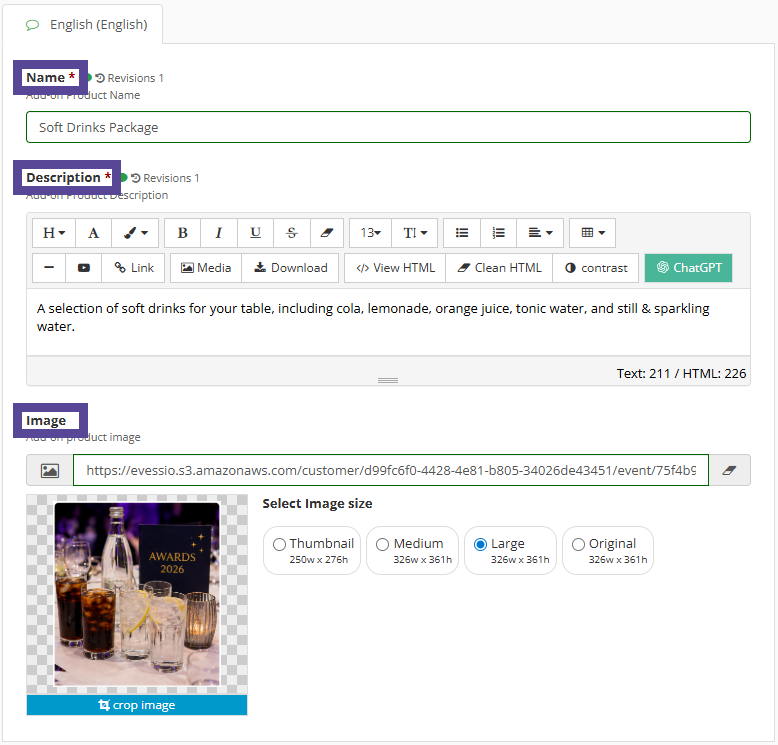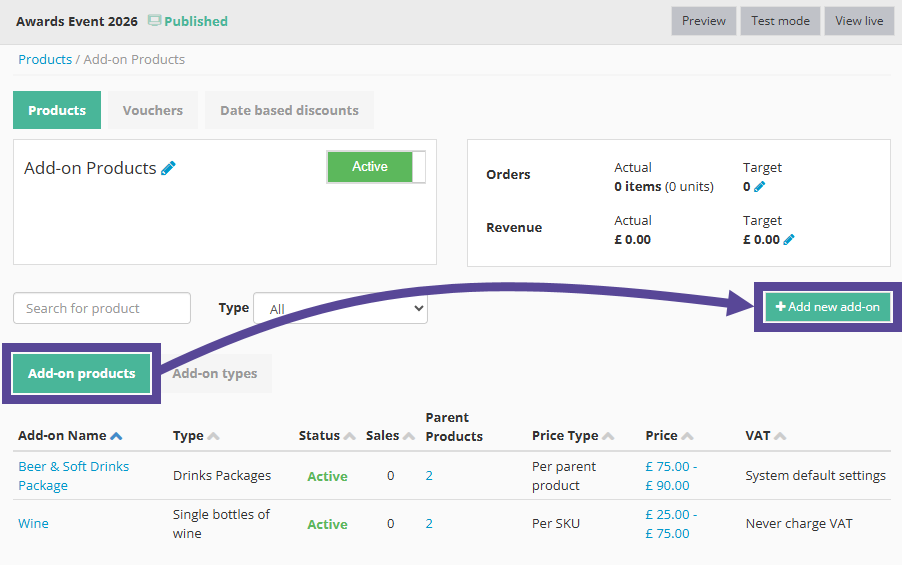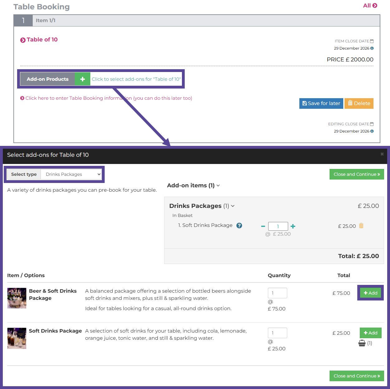 Add-ons are grouped into types, with different options and pricing to suit your event setup.