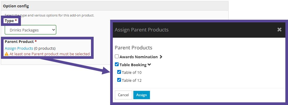 Then, assign the Parent Product(s) of this add-on product. Your add-on will only appear for purchase alongside the parent product(s) it is associated with.