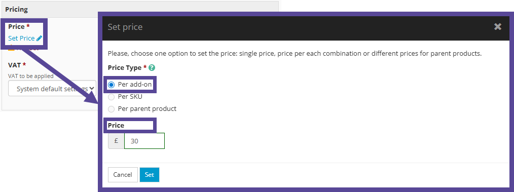 This options allows you to assign one fixed price for the add-on item, regardless of which product(s) are selected.