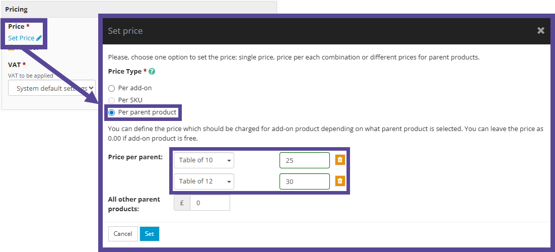 You can set the price per parent product e.g. a drinks package will cost £30 for your Table of 12 and £25 for your Table of 10.