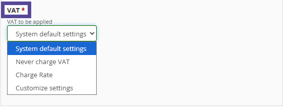 Finally, assign the VAT settings. If your add-on product should follow your event's standard VAT settings, leave this option at System Default Settings. If you prefer for this add-on product to have different settings to your general event, choose one of the other options.