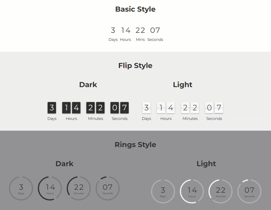 With Evessio's Countdown timer, there are three styles available. The style is chosen during the creation of your countdown timer, and can be changed at any time. You can choose between Basic, Flip or Rings style.