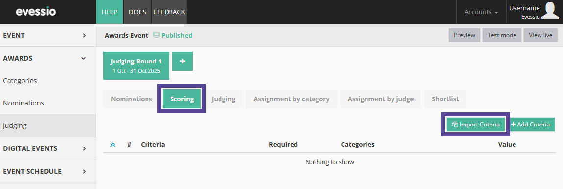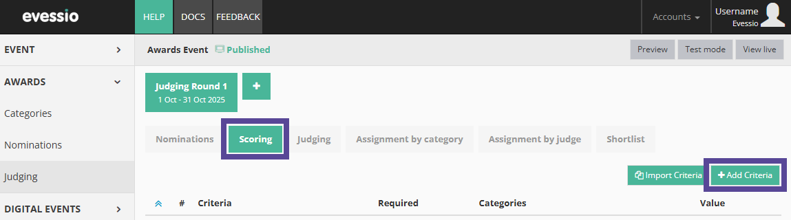 To add your scoring criteria, go to Awards > Judging, and click on the Scoring tab inside your judging round.