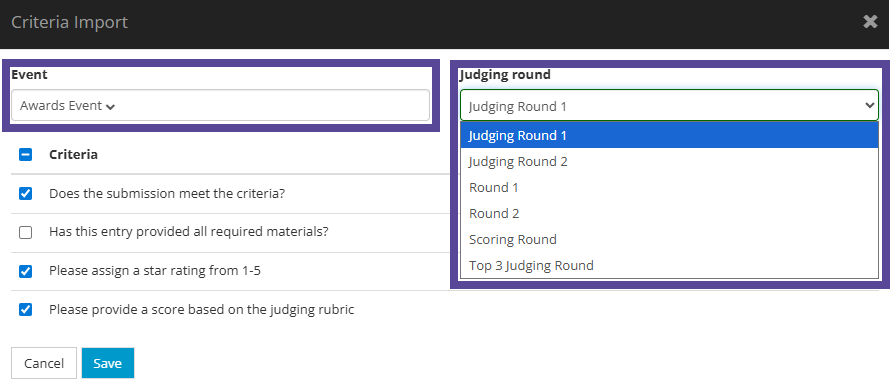 In the pop-up, select which event and judging round you want to import the criteria from.