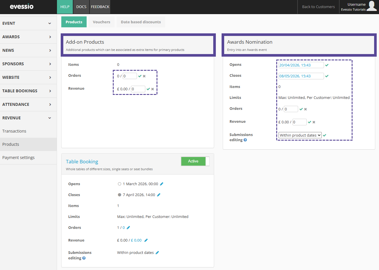 | Awards Nomination | Awards Nomination Products are your categories and entry forms. You can create awards nomination products and their entry forms in Awards > Categories, and configure their behaviour in the Product area. | Awards |