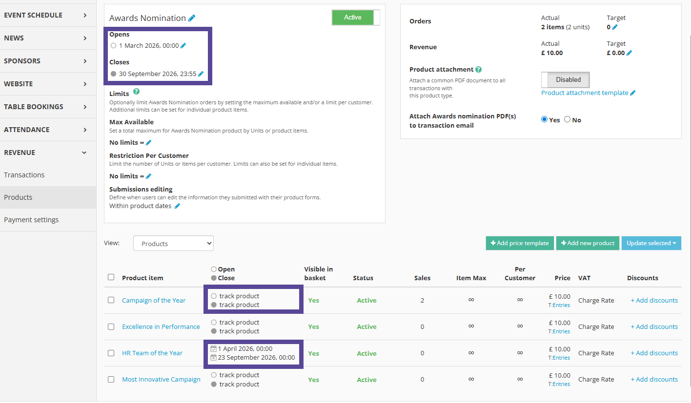 If you wish for all products within your product type to follow the general availability dates, ensure they say Track Product beside both the open and close date. This means they are linked to the general availability dates, and ensures that if you amend your overall product availability dates, all individual products will be changed too.