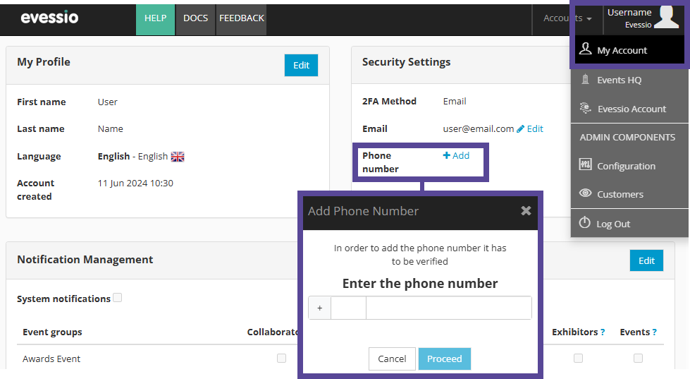 First, hover over your name in the top right corner of your Evessio admin portal, and select My Account.
