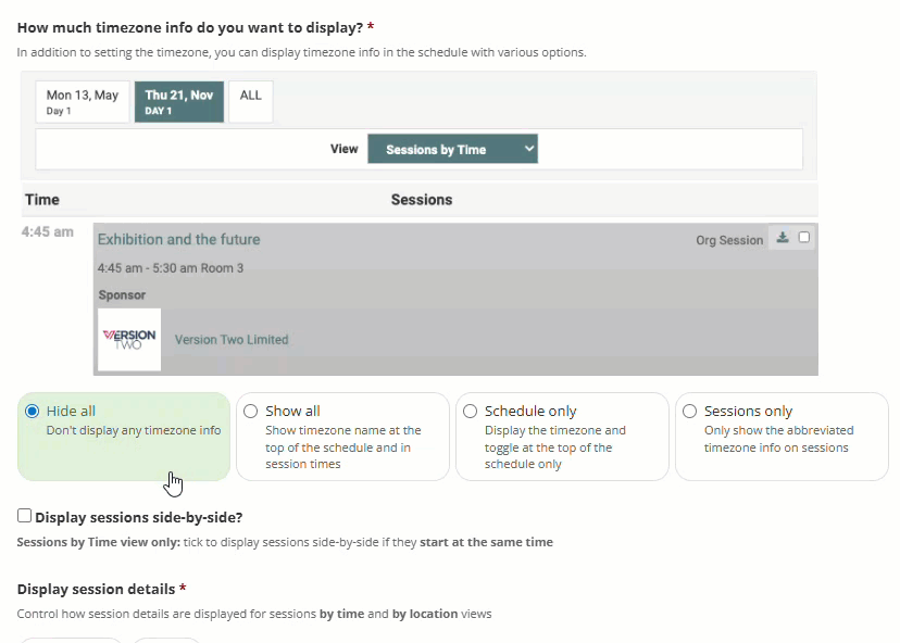 You can also control how much time zone information is displayed, choosing to hide all, show all, show the time zone at the top of the schedule, or show the time zone in the session detail.