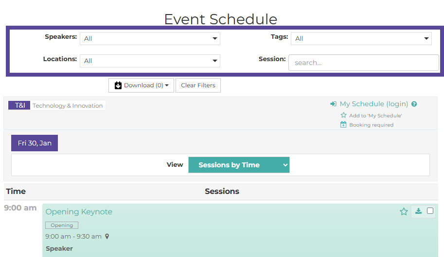 Below, you can choose to show or hide filters. Filters allow you change the view of your schedule by speaker, location and/or topics.