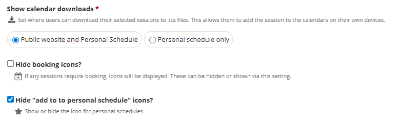 Next, you can choose how calendar downloads work on your schedule. With this setting, you can choose where users will find the option to download their selected sessions to .ics files.