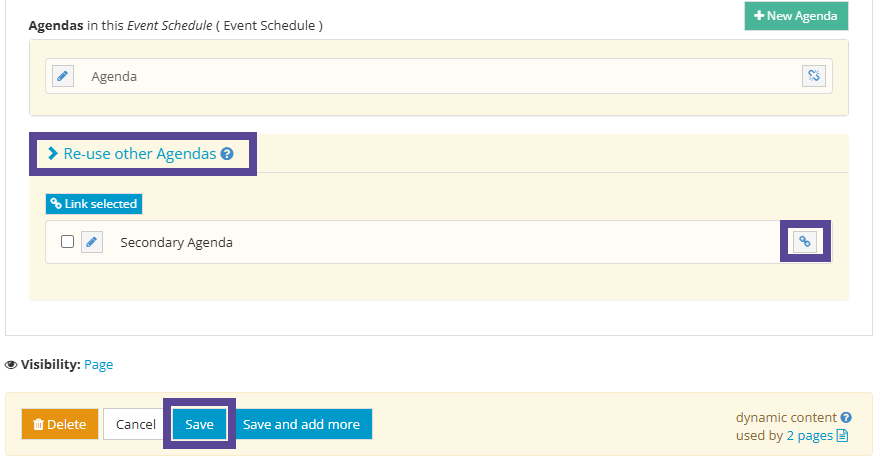 To find the prepared agendas, open the area titled Re-use other Agendas, where your already-created agendas will be listed. Click on the link button to add this to your schedule.