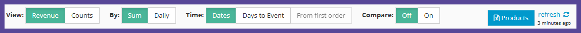 Choose what metric to display on the Y-axis of the chart: • Revenue: Shows monetary values over time • Counts: Shows the number of products sold or ordered |