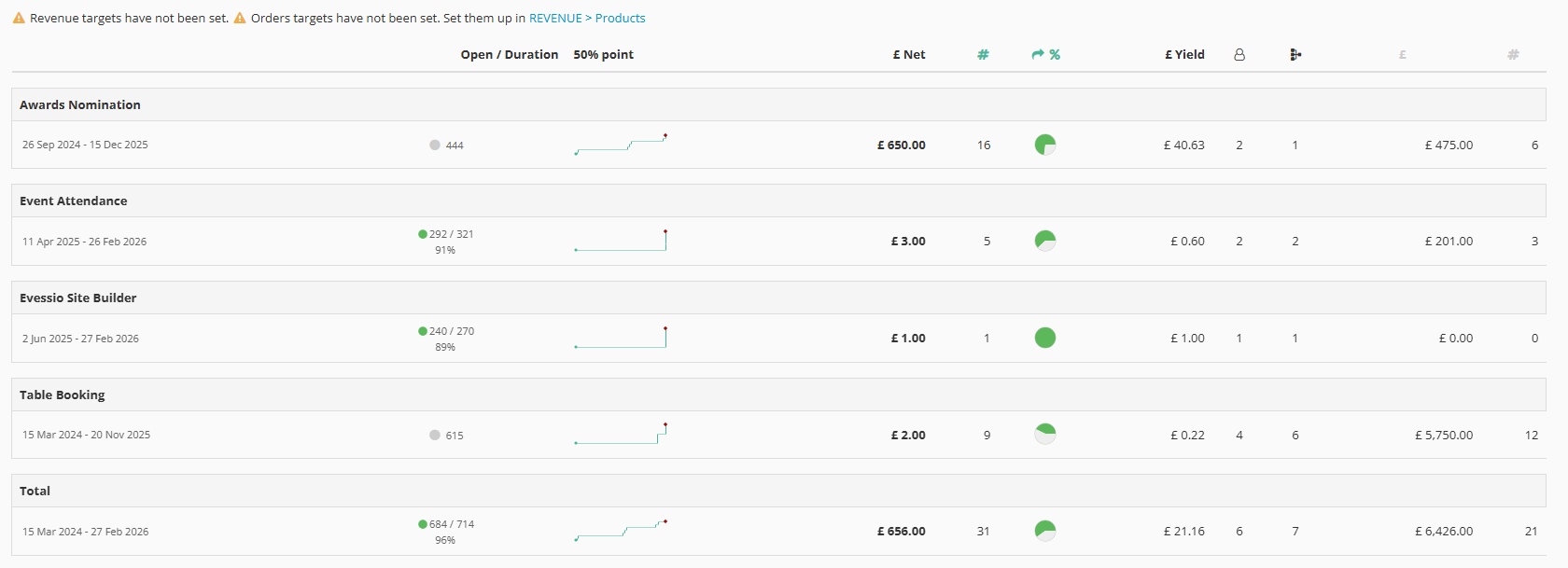 Fields marked with⚠️ are dependent on you adding targets to your revenue and/or orders. You can do this for each of your products in Revenue > Products.