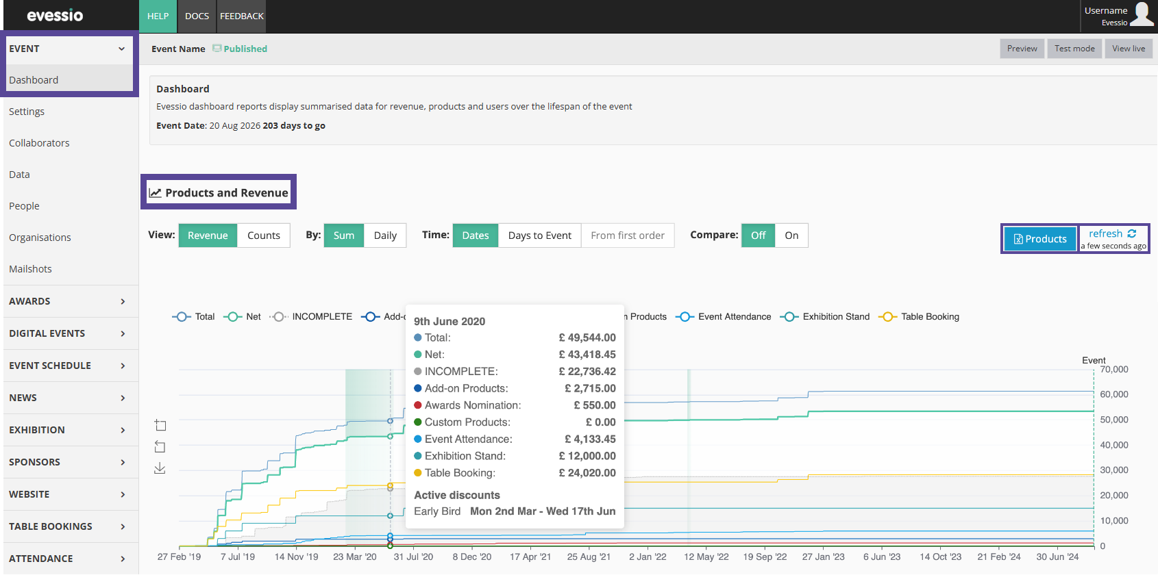 The Event Dashboard reports display summarised data for revenue, products and users over the lifespan of the event.