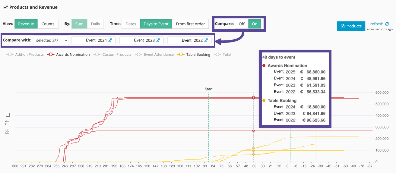 This comparison feature is particularly useful for understanding seasonal patterns, evaluating the impact of marketing campaigns, or assessing whether early sales indicators are on track compared to successful previous events.