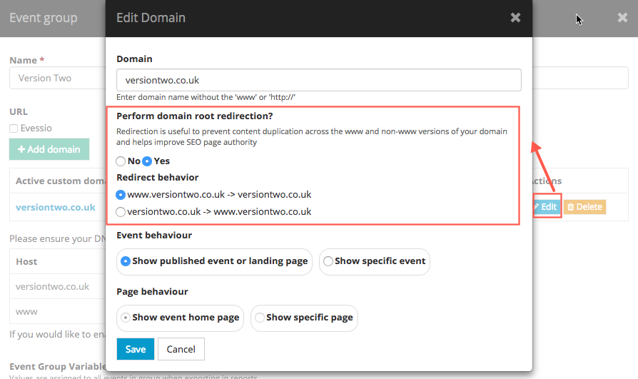 When setting up your custom domain for an Evessio event, you will provide the 'root' domain e.g. versiontwo.co.uk (not www.versiontwo.co.uk)