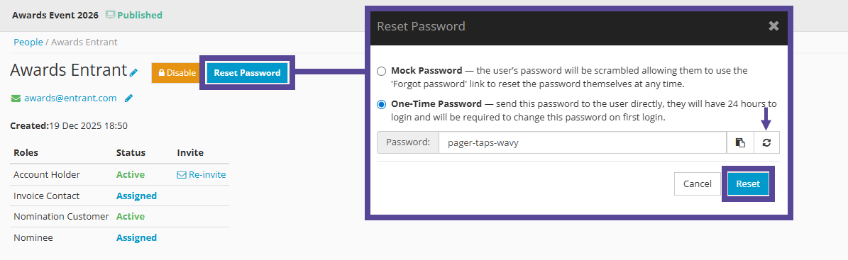 You can also enter into a Person Profile to amend details, reset their password, and review their history within your event.