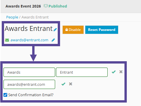 If an error is identified within an account such as making a typo in a name or email address, you can easily amend this in their person profile.